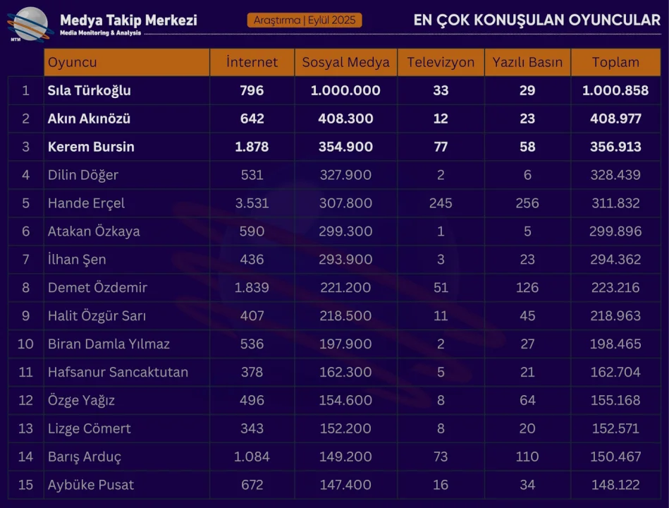 MTM Medya Takip Merkezi’nin 01–30 Eylül 2025 tarihleri arasında internet, sosyal medya, televizyon ve yazılı basını kapsayan 10 bini aşkın kaynak üzerinden hazırladığı rapor, medya ve sosyal medyada en çok konuşulan oyuncuları ortaya koydu. Veriler, yaz döneminin ardından başlayan yeni yayın sezonuyla birlikte hem ekranlarda hem dijital mecralarda dikkat çekici bir hareketliliğe işaret ediyor.